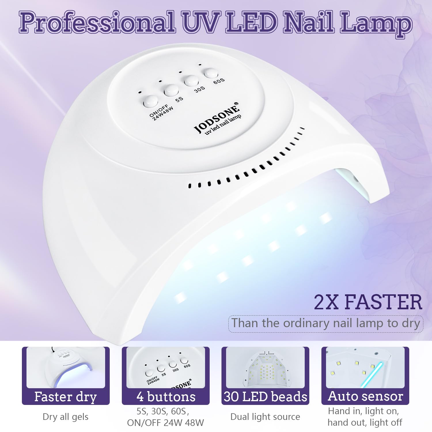 - Nail Lamp: This product has 3 curing modes; 5s, 30s and 60s, normally the gel curing time is 60s-120s, so that the gel will be more solid and long lasting. And the nail lamp has no bottom, thus, it is convenient for toe nail art.