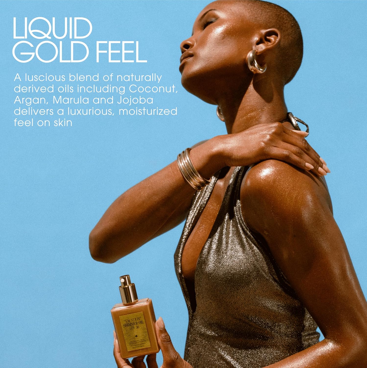 - LIQUID GOLD FEEL: Formulated with Argan, Marula, Coconut, and Jojoba, this body shimmer oil envelops your skin in a silky, moisturizing veil of blend of luscious natural oils, peptides, and Hyaluronic Acid.